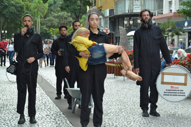 “Quinze de fevereiro de 2017, Dandara foi covardemente espancada com soco, chutes e pauladas. Foi carregada por um carrinho de mão pela rua enquanto era agredida brutalmente até a morte pelo fato de existir”, era o que repetia uma atriz em pleno calçadão da Rua XV. O trecho integra a peça Eu em Ti – Retratos, uma das apresentações de rua do Festival de Curitiba, que trouxe para os palcos a denúncia do assassinato de Dandara dos Santos, 42 anos, espancada e executada a tiros no Bom Jardim, bairro de Fortaleza, no Ceará.